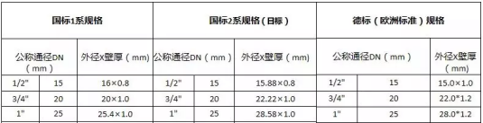 正常情況下一般是這樣采用的:工程一般采用國標(biāo)1系,家裝一般采用日本標(biāo)準(zhǔn)也就是國標(biāo)2系,316L的不銹鋼一般采用著德國標(biāo)準(zhǔn),薄壁不銹鋼的三個標(biāo)準(zhǔn)的表格如下: